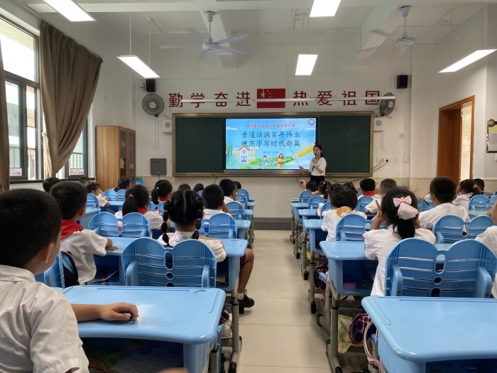 在德育處的組織下,各班精心開展了以“普通話誦百年偉業,規范字寫時代新篇”為主題的班隊會活動,積極宣傳《中華人民共和國國家通用語言文字法》以及相應的普通話基礎知識。