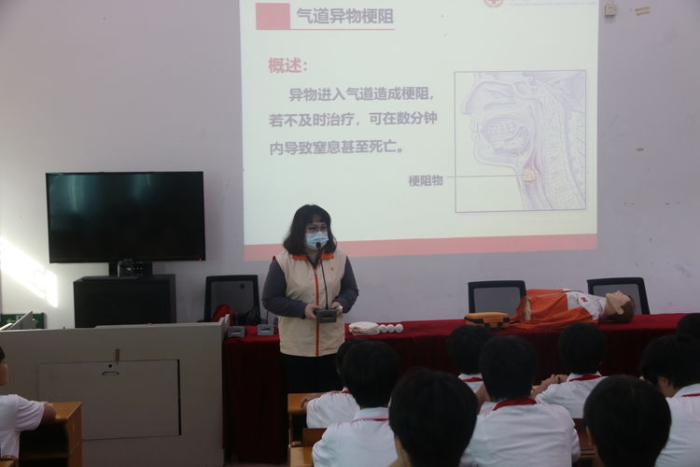 黎子丹老師通過將理論教學、案例講解和創(chuàng)設(shè)情景三者有機結(jié)合,認真、耐心、仔細地幫助師生了解到了氣道異物梗阻、燒燙傷、中暑、鼻出血等一系列突發(fā)狀況在日常生活中出現(xiàn)的誘因、表現(xiàn)的病狀及緊急處理方法和預(yù)防措施,其講解過程清晰明了,語言通俗生動,引發(fā)了師生們濃厚的興趣,適時的問答環(huán)節(jié)更是讓現(xiàn)場氣氛保持活躍。