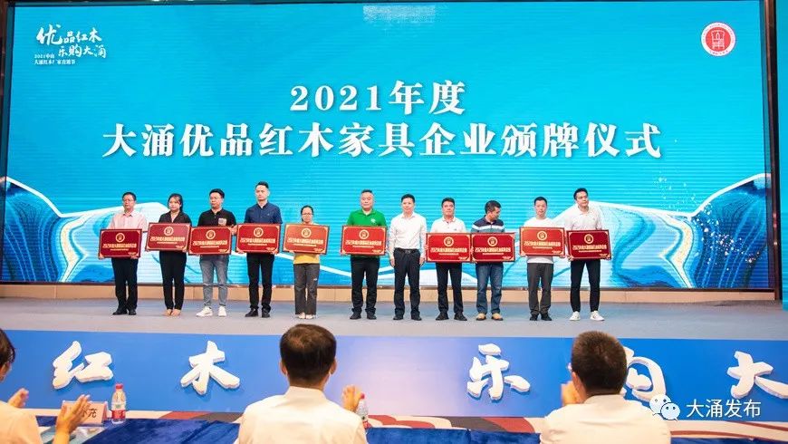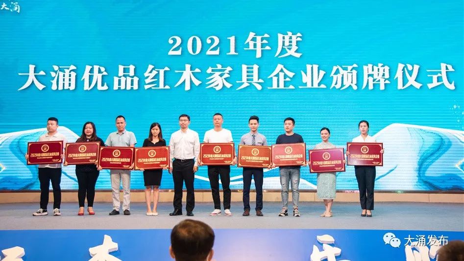 現場還向中山市伍氏大觀園家具有限公司等18家紅木企業,頒發“2021年度優品紅木家具企業”牌匾。