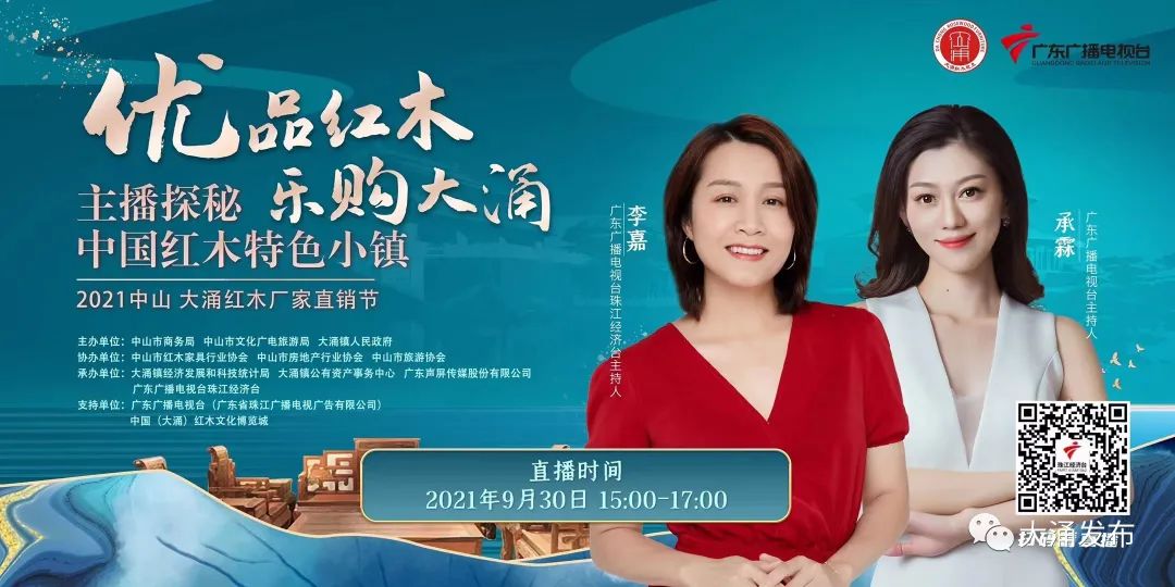 9月30日下午3:00,廣東廣播電視臺知名主持人李嘉、承霖將走進紅木文化旅游特色小鎮,直播探訪伍氏大觀園、紅古軒、地天泰、博大、印巷森刻等大涌紅木優品企業,與百萬粉絲觀眾展開長達兩個小時的線上紅木文化體驗之旅。