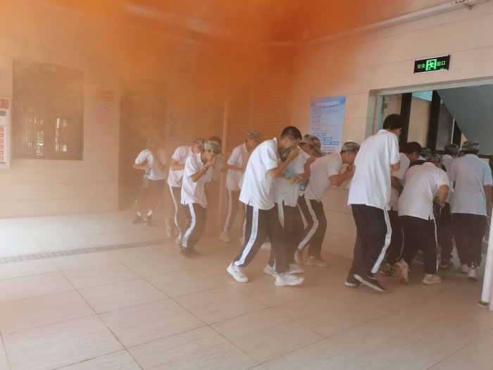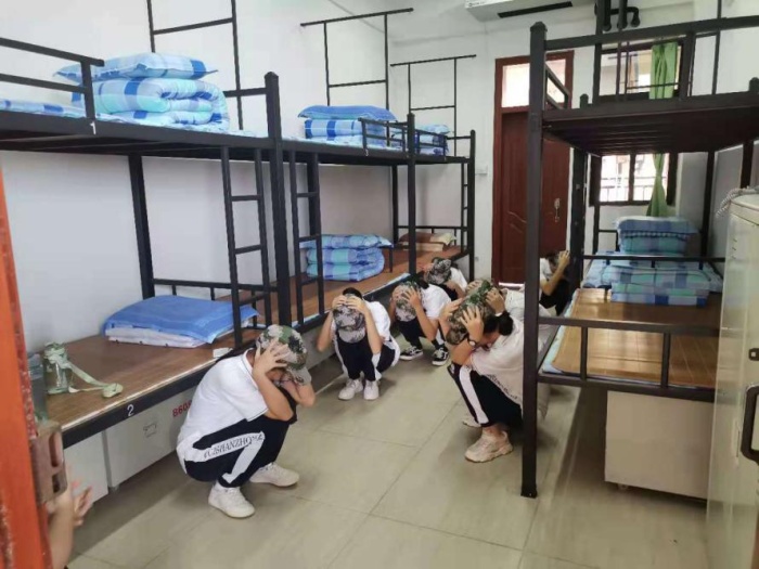下午,宿舍地震疏散逃生演練正式開始。只聽模擬地震發(fā)生的信號——三聲短哨聲傳來,宿舍里的同學(xué)們行動迅速,立即就近躲避,用手保護(hù)著自己的頭部和頸部,背靠柜子、床架或墻角。接著,一聲長哨信號傳來,學(xué)生陸續(xù)開始疏散。各班班主任在指定位置、在恰當(dāng)時機燃放早已準(zhǔn)備好的無毒煙霧彈,為地震演習(xí)營造了更逼真的效果。守在樓梯口的老師們一邊維持秩序,一邊提醒同學(xué)們做好抱頭、彎腰、捂鼻等必要動作。同學(xué)們疏散到廣場后,各班班主任快速清點本班人數(shù)并及時報告。在整個疏散過程中,師生配合默契,組織有條不紊,人人各盡其責(zé)。