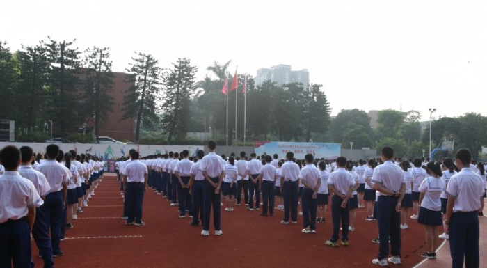 8時,在全體師生的注目禮下,學校舉行莊嚴的升旗儀式。全體師生高唱《義勇軍進行曲》,鮮艷的五星紅旗,從學校國旗護衛隊同學手中冉冉升起。