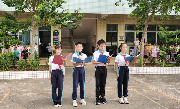 八點(diǎn)整,升國(guó)旗儀式正式開(kāi)始。國(guó)旗護(hù)衛(wèi)隊(duì)邁著堅(jiān)定的步伐走向升旗臺(tái)。鮮艷的五星紅旗在激昂雄壯的國(guó)歌聲中冉冉升起、迎風(fēng)飄揚(yáng),全體師生肅立注目,齊唱國(guó)歌。國(guó)旗下,教務(wù)處主任吳偉卿激勵(lì)每一位學(xué)生要感恩國(guó)家的付出,好好學(xué)習(xí),豐富知識(shí),增長(zhǎng)才干,長(zhǎng)大后把祖國(guó)建設(shè)得更加強(qiáng)大。接著,六(1)班的四位同學(xué)以激情澎湃的詩(shī)朗誦《強(qiáng)國(guó)力量》向偉大的祖國(guó)致敬。他們把文字蘊(yùn)含的振奮人心、群情激昂、波瀾壯闊和自己內(nèi)心對(duì)偉大的黨和親愛(ài)的祖國(guó)的熱愛(ài)和自豪之情,展現(xiàn)得淋漓盡致,深入人心。