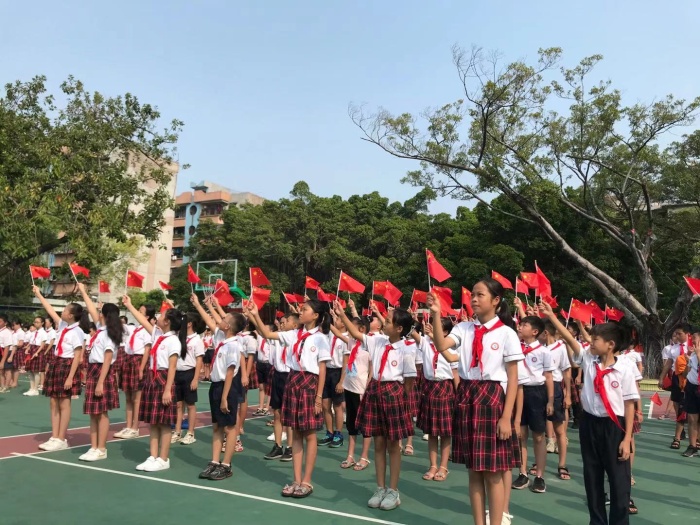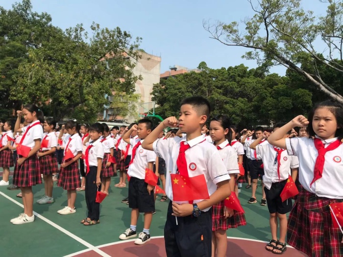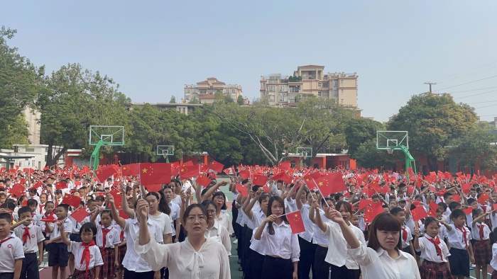 為慶祝中華人民共和國成立72周年,引導學生弘揚愛國主義精神,培育和踐行社會主義核心價值觀,樹立聽黨話、跟黨走的信念,抒發熱愛祖國、祝福祖國的情感,2021年9月30日,黃圃雛鷹學校全體師生歡聚一堂舉行了“致敬英雄,向國旗敬禮”愛國主題教育活動,用歌聲向祖國媽媽獻上自己深深的祝福。