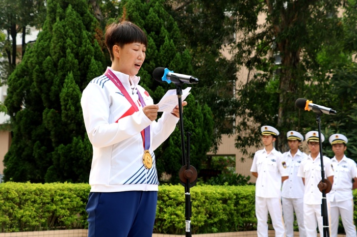 歡迎冠軍回家,在隆重的升旗儀式中拉開序幕。首先,由傅彬同學代表永中全體師生為孫麗艷老師獻上鮮花,祝賀她載譽歸來!全場沸騰,響起了經久熱烈的掌聲。冠軍是榮耀,冠軍是令人羨慕!這是廣東省人民的驕傲、中山市人民的驕傲、小欖鎮人民的驕傲,更是永中師生的驕傲!
