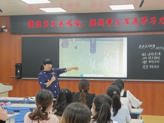 接著是同樂小學周思琴老師精彩的課例展示——《快樂讀書吧:中國民間故事》。周老師從“快問快答”的課前互動游戲入手,激發了學生了解民間故事的興趣,重點引導學生在對比閱讀中體會中國民間故事的特點,同時通過閱讀分享交流和小組合作演一演,讓學生切身感受到民間故事的藝術魅力,激發了學生對傳統文化的熱愛。
