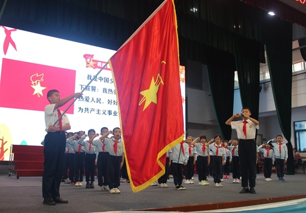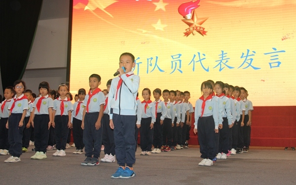 新隊員們在少先隊大隊委蔡鯤燁的帶領下,面對莊嚴的隊旗,舉起右拳鄭重地宣誓。新隊員代表饒志城同學作為新隊員代表發言表決心,此時他的心情是激動的,是光榮的,是自豪的。吳靖華同學作為老隊員代表發言,她勉勵新隊員要用自己的實際行動為紅領巾增光添彩。隨后,大家一起欣賞由合唱隊的六名少先隊員帶來的小組唱《童心向黨》?;顒幼詈螅箨牳陛o導員司徒詠老師作活動小結并帶領全體少先隊員呼號。莊嚴的入隊儀式在孩子們的呼號聲中拉下帷幕。