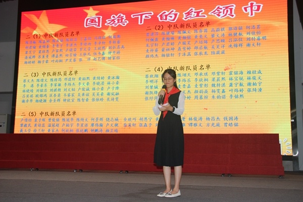 隨著莊嚴有序的出旗曲,朝氣蓬勃的旗手伴樂出旗,入隊儀式正式開始?!安慌吕щy,不怕敵人,頑強學習,堅決斗爭……”全體少先隊員在李曉雯同學的指揮下唱響中國少年先鋒隊隊歌。隨后,全體同學一起回顧少先隊歷史,觀看影片——《致敬紅領巾》。最令人期待的新隊員入隊儀式開始了!大隊副輔導員司徒詠老師宣讀了新隊員名單。173名孩子被正式批準加入少先隊組織,成為一名光榮的少先隊員。