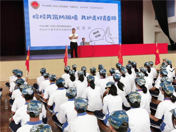10月12日,中山市小欖中學(xué)新生軍訓(xùn)正在如火如荼地進(jìn)行著。軍訓(xùn),既是訓(xùn)練身體的重要時刻,更是全面育人的重要時機(jī)。在當(dāng)天的軍訓(xùn)中,中山市第二市區(qū)人民檢察院檢察長、中山市小欖中學(xué)法治副校長周景聲同志來到學(xué)校,為全體學(xué)生帶來法治講座——《檢校共筑防騙墻 共護(hù)走好清純路》,學(xué)校范衛(wèi)平校長陪同并感謝周檢察長對新生的關(guān)愛和呵護(hù),對學(xué)校工作的關(guān)心和支持。