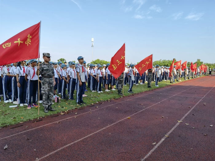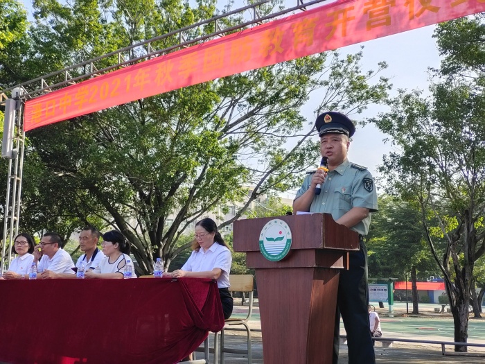 為了強化學生的國防意識,進一步培養學生的愛國情操,增強班集體的凝聚力和向心力,提升學生健康的身心素養,2021年10月11日,中山市港口中學初一新生舉辦了國防教育開營儀式。教育和體育事務中心劉憲軍主任、鎮武裝部副部長賀洪彪先生、學校廖志堅校長攜同全體行政、初一各班班主任出席了本次活動。