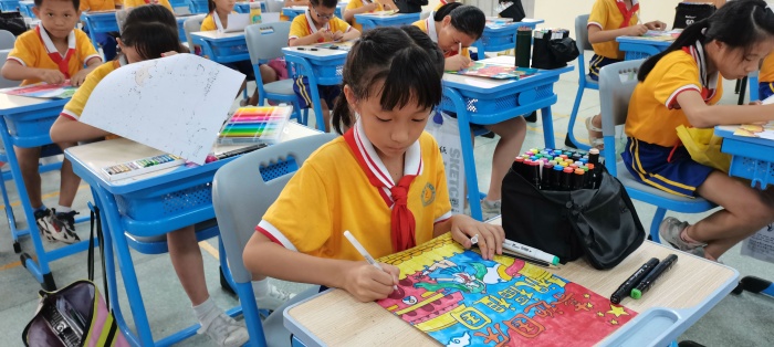 本次以“喜迎國慶,祝福祖國”為主題的愛國主義繪畫活動在南朗小學大禮堂進行現場書畫創作。比賽現場,同學們作畫方式多樣:有的同學先用鉛筆構圖;有的同學直接用勾線筆造型;還有的同學用的是水彩的表現手法。同學們通過各種線條、色彩,仔細地描繪和表達他們看到的、感受到的、想到的心中最美的祖國,畫中充滿對祖國的大好河山的喜愛之情,流露出對祖國母親深深的熱愛。而在書法比賽現場中,同學們書寫的是習近平總書記的重要講話內容,字字都表達了同學們對中華人民共和國深深的愛意。