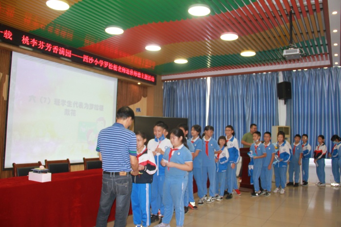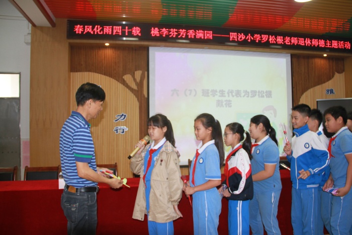在經久不息的掌聲中,四沙小學校長歐慧芳向羅松根老師贈送了上書“春風化雨四十載 桃李芬芳香滿園”的錦旗,表達了對羅松根老師為人民的教育事業所作出的巨大貢獻的充分肯定。羅老師也上臺作了發言。他希望全體同學聽老師的話,好好學習,天天向上,長大后做一個對社會有用的人。