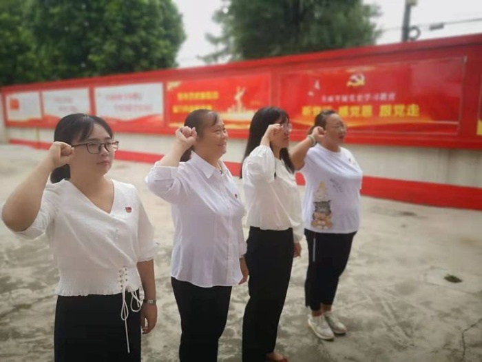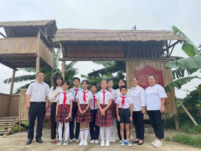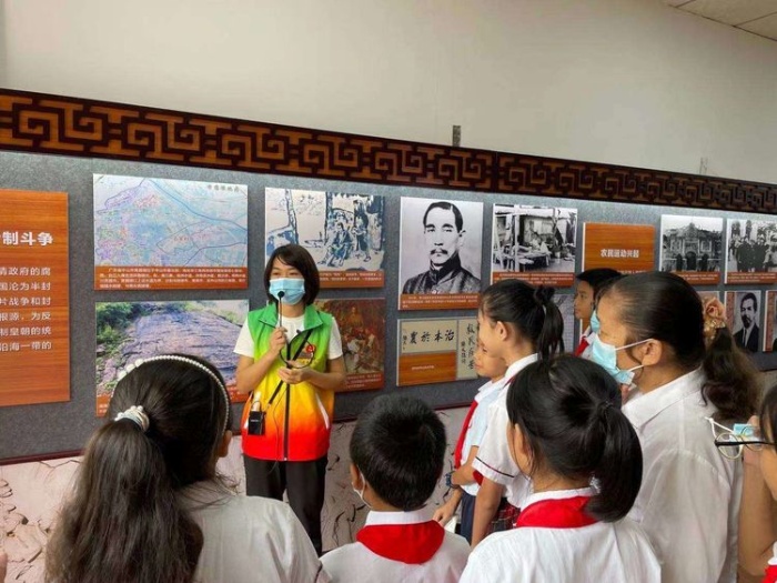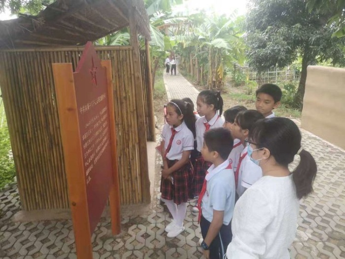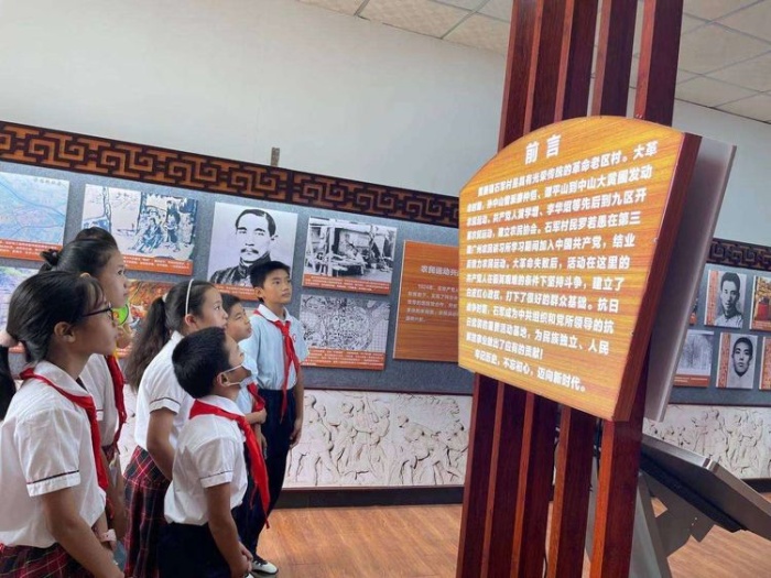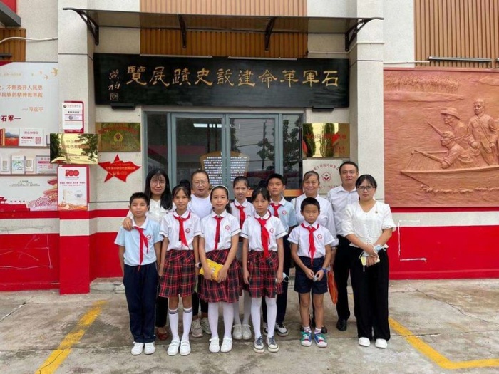 石軍村是具有光榮傳統(tǒng)的革命老區(qū)村。2006年,石軍革命建設(shè)史跡展覽館落成并對外開放,是中山市第一個村級黨史學(xué)習(xí)教育基地。在學(xué)校黨支部書記鄒淑霞和張華校長的帶領(lǐng)下,4名黨員教師在石軍村革命展覽館前,面對黨旗,莊嚴(yán)宣誓,重溫入黨誓詞。接著,在講解員的帶領(lǐng)下,少先隊員和黨員教師們懷著對革命先輩的無比崇敬,認(rèn)真聽取講解員的講解,了解了陳岸、羅若愚等中共黨員先輩的英雄故事;仔細(xì)觀看了各展廊內(nèi)的文字介紹、圖片和珍貴實物等,了解黃圃農(nóng)民運動的歷史細(xì)節(jié)。