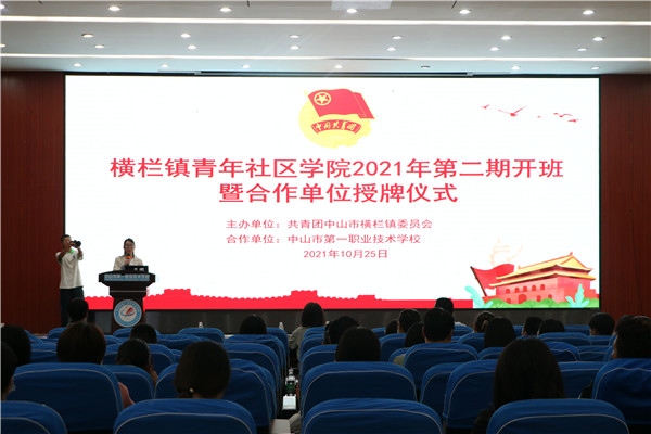 為充分發揮職業學校的人才場地優勢,推動學校的對外培訓工作, 10月25日晚,中山市第一職業技術學校舉辦了橫欄鎮青年社區學院2021年第二期課程開班暨合作單位授牌儀式。橫欄鎮團委書記鄭靜爽,中山一職校企合作部主任蔡權、團委書記李思文,橫欄鎮團委和中山一職校企合作部工作人員,以及授課的老師和全體學員參加了活動。儀式由校企合作部杜少勇老師主持。