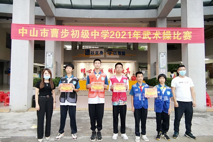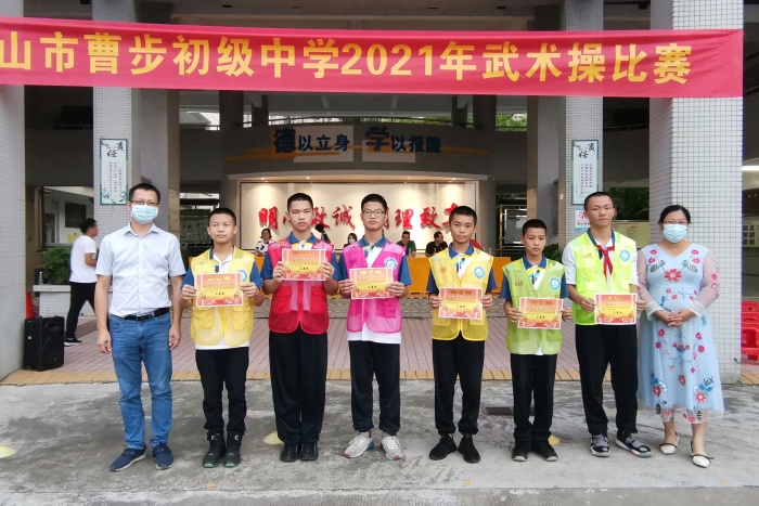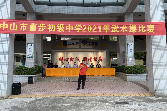 為了更好地促進曹步初級中學學生身體素質的提高,全面推行學校特色項目的發展,促進體藝2+2項目的建設,檢測初一、初二學生課間操的學習成果,以“習慣養成”為原則,規范學校管理,加強班風班貌和精神文明建設,加強德育、智育、體育的發展和合作,全面增強班級凝聚力,促進學風、校風建設,使課間達到規范化、熟練化、美觀化,2021年10月20日下午,曹步初級中學在中大堂前舉行了初一、初二級課間操行為規范比賽暨武術操比賽,本次活動由體育老師賀坤主持,初一初二全體同學和部分家長參加了本次活動,學校領導和部分家委擔任本次活動的評委。