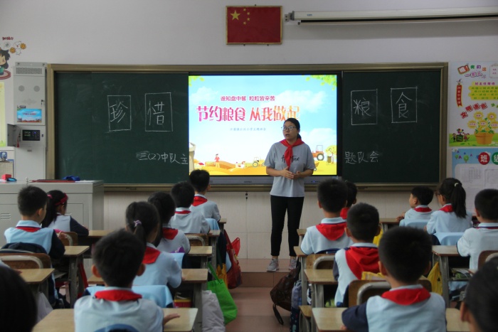 在各班主題隊會上,老師展示了貧困地區糧食稀缺的現狀以及社會上一些人浪費糧食的現象,兩種對比,讓隊員們從內心體會到糧食的來之不易以及“誰知盤中餐,粒粒皆辛苦”的深刻內涵,并自覺承諾從現在做起,從自身做起,節約每一粒糧食,抵制和反對浪費糧食的行為,養成愛糧節糧的好習慣。