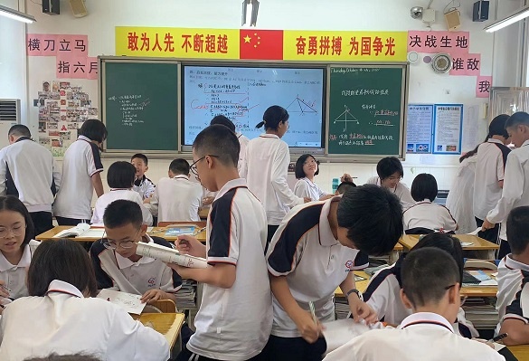 中山市數(shù)學(xué)教研室周曙老師等2名專家走進(jìn)了王曼莉老師在初二(12)班的《線段的垂直平分線的性質(zhì)》課堂。王老師靈活運(yùn)用多媒體設(shè)備,采用豐富多彩的形式進(jìn)行授課,課堂氣氛活躍,小組合作討論、展示,師生、生生互動(dòng)良好,呈現(xiàn)出靈動(dòng)高效的教學(xué)樣態(tài)。