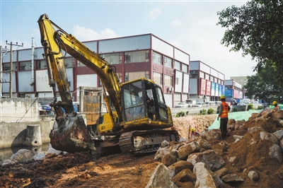 11月4日,工人正在沙溪鎮黑臭水體整治現場作業。
