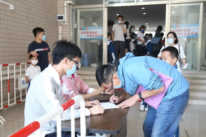 接種現場,在醫護人員的引導下,孩子們有序進行體溫測量、手部消毒、健康問詢、提交《新冠疫苗知情同意書》等流程。