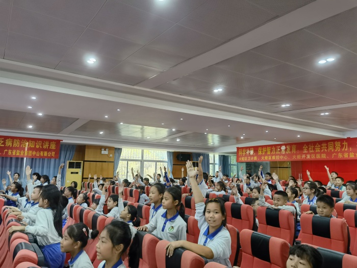 講座中,火炬開發區醫院兒童保健科鄧成主任醫師用風趣幽默的語言和生動形象的圖片展示,講解了碘的作用、缺碘的危害、怎樣科學補碘等方面的科普知識,同學們知道了碘是人體不可缺少的一種營養素,缺碘不僅會導致“大脖子病”、體格發育障礙,更為嚴重的是影響腦發育,導致智力損傷。鄧成主任醫師還通過有獎競猜的方式,吸引學生的興趣,將活動推向了高潮。鹽業公司鄧奕主管更通過科學小實驗,為同學們講解了如何辨別真假食鹽。學生認真聆聽并積極參與實驗,現場有序,氣氛熱烈。