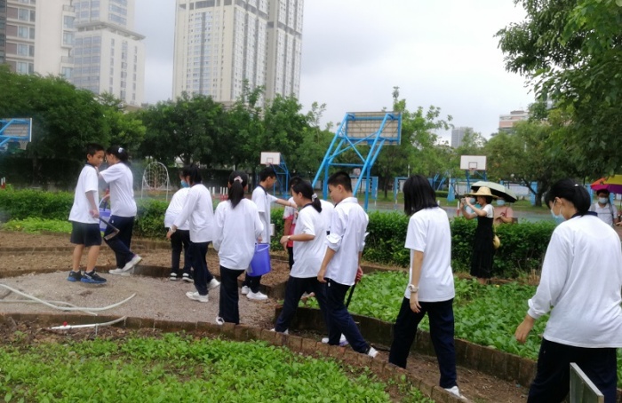 忽然天空下起了小雨,古老師要求學生們停下來去避雨。學生們卻不同意,他們紛紛喊著“雨很小”“我能繼續干”“老師,我想干完”......繼續熱火朝天地勞動著。但雨越下越大,古老師帶領學生們到休息處避雨,并對剛才各組的種菜活動進行了討論和小結。5分鐘后,雨停了,學生們紛紛再次走進菜地,開心地繼續勞動。