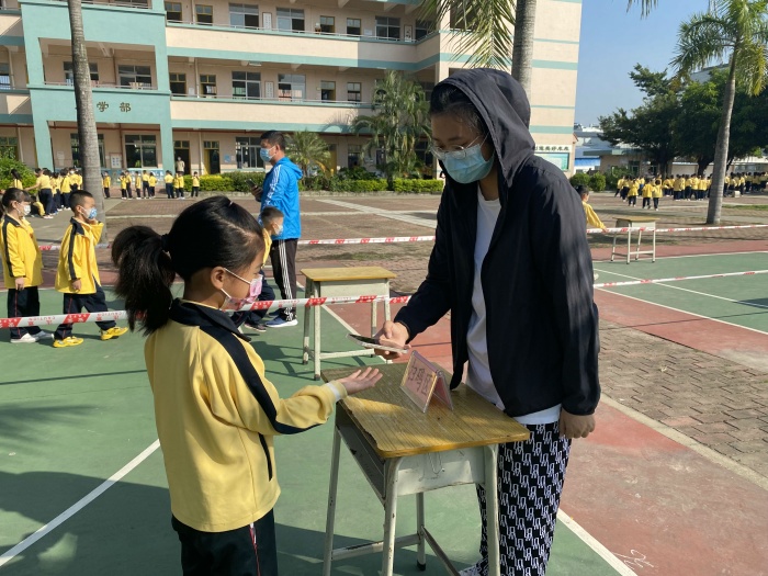 同學們帶好自己的二維碼,拍好整整齊齊的隊伍,有條不紊、按要求進入監測分區,他們佩戴好口罩,保持好間距,安安靜靜,依次通過檢測口,顯得紀律嚴明,訓練有素。