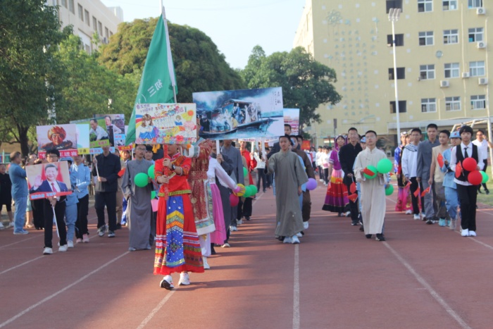 在秋日的艷陽之中,橫欄中學(xué)田徑場鑼鼓喧天、彩旗飄揚,學(xué)校國旗方陣、校旗方陣、裁判員方陣以及初一、初二、初三三個年級的班級方陣依次走過主席臺。各班隊伍精神飽滿、隊列整齊、口號響亮,整齊的班服、各具特色的民族服飾、鮮艷的五星紅旗、愛黨愛國的橫幅標(biāo)語,充分體現(xiàn)了橫中學(xué)子的創(chuàng)意、激情和夢想。