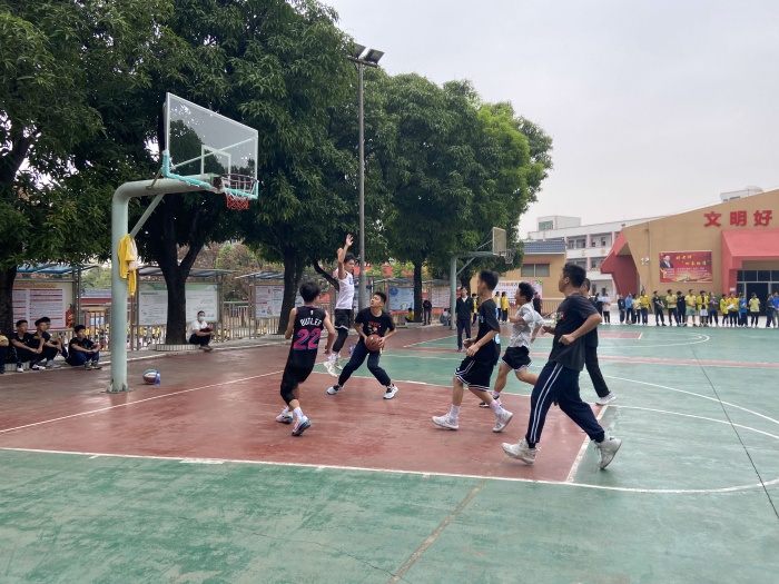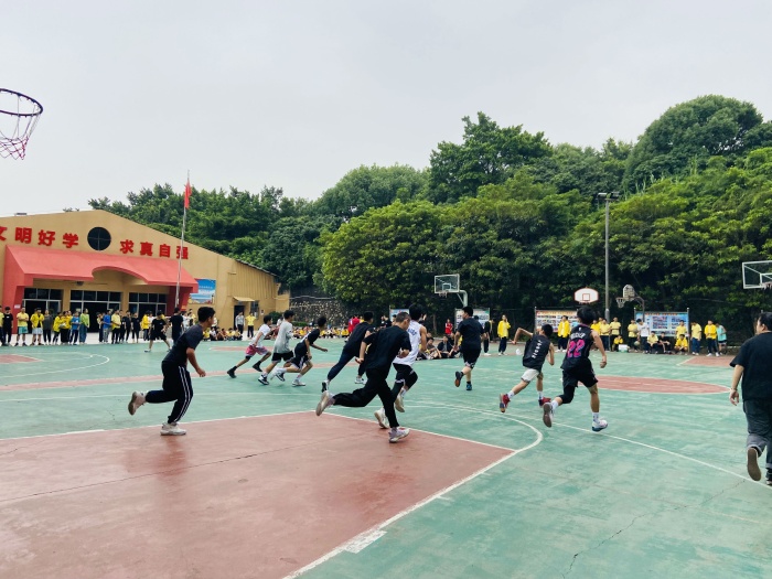 內操場正在進行的是初中部的籃球賽,參賽隊員生龍活虎,在場上運球、急停、跳投,球進了!場上的拉拉隊立刻爆發出陣陣喝彩聲。把比賽的氣氛逐步推向高潮。