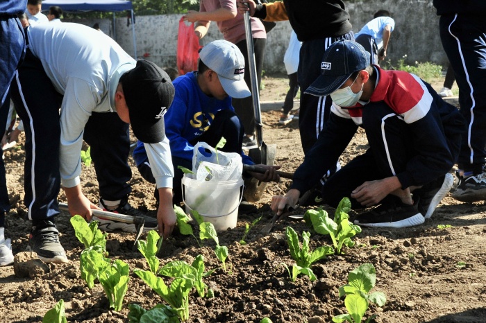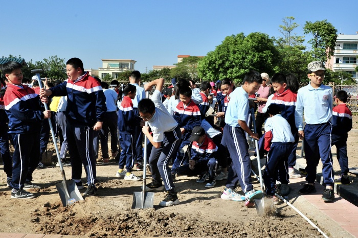 同學們有種植花卉的經驗,可面對扎實堅硬的荒地,還是頭一次掄起翻土的鐵鍬呢。在家長和老師的示范下,同學們輪流學用沉重的鐵鍬翻地,大塊的泥頭被掘起,菜地里揚起一陣灰塵。同學們深知耕種不易,是實實在在的技術活和體力活。翻土之后就是整地,同學們用小的鋤頭把大塊的泥頭敲碎,在有種菜經驗的家長的指導下起壟做畦,種下菜苗,澆水固根。