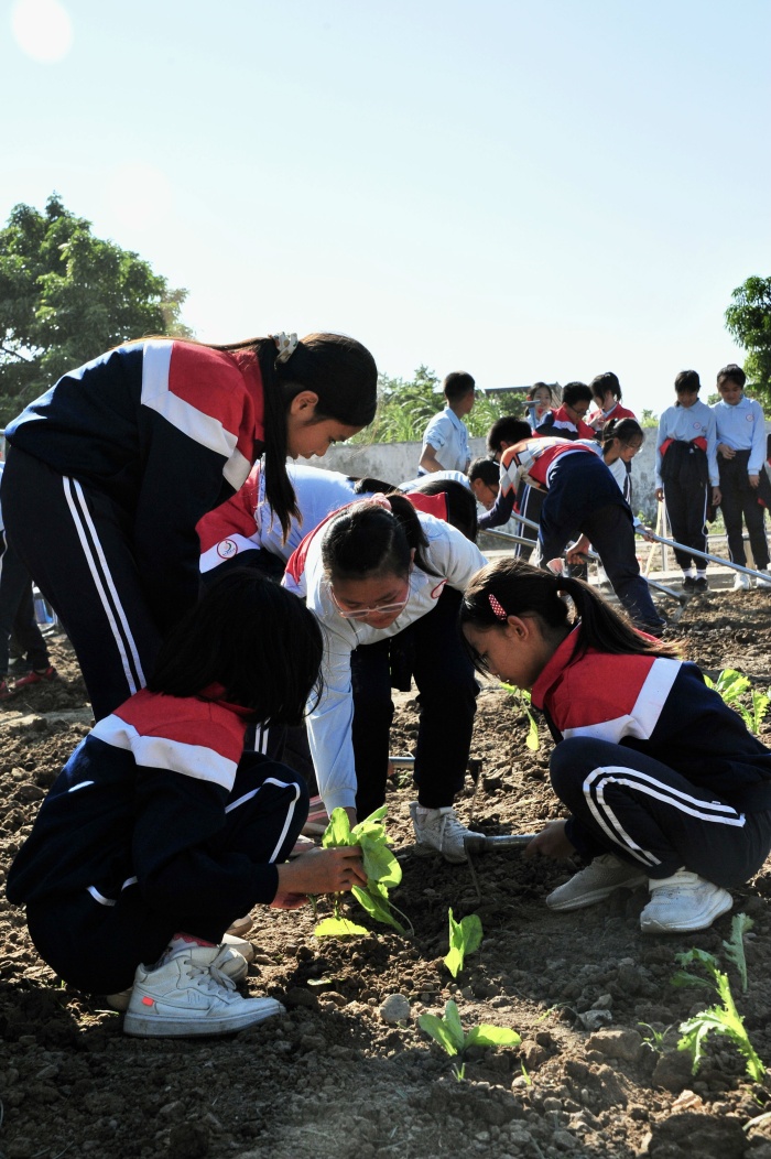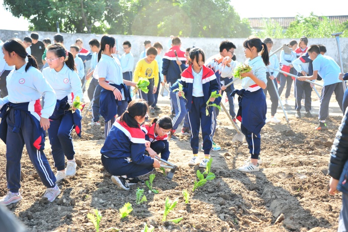 研學之旅,知行合一。六年級四個班的學生分為兩大組,一組負責開拓荒田——種菜苗,一組負責刷鍋洗碗——煮飯。