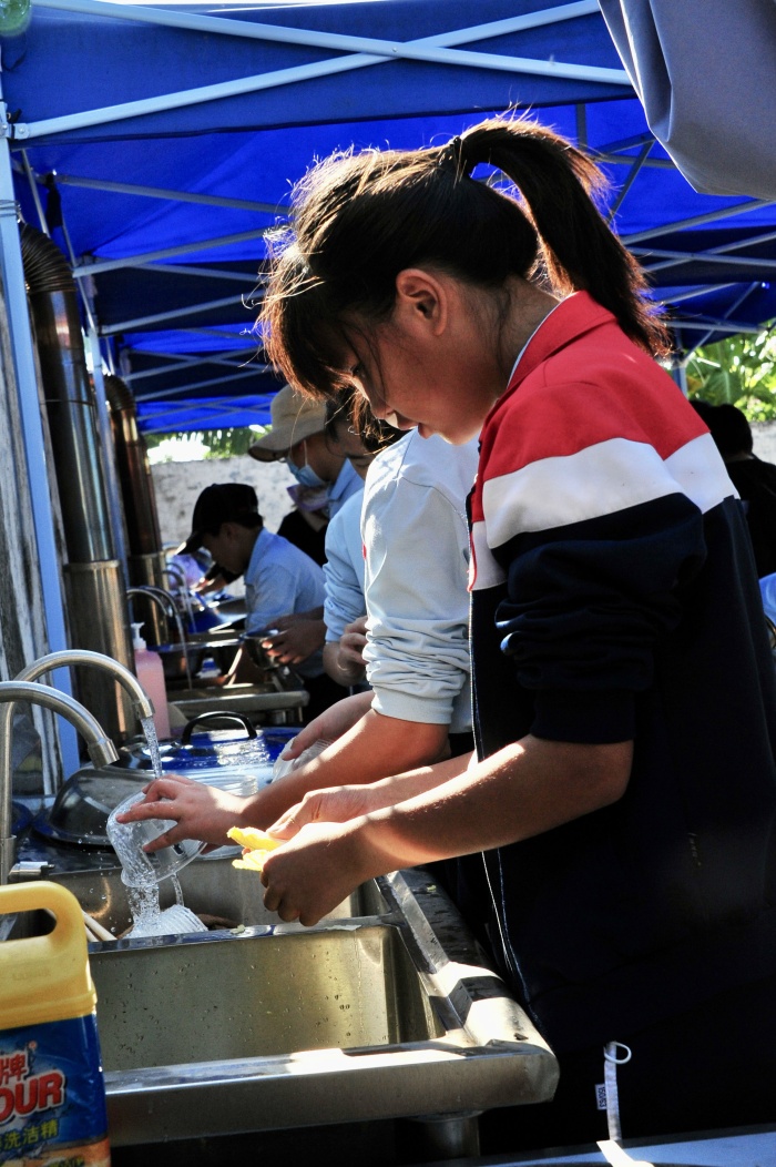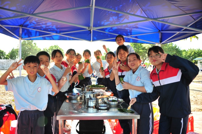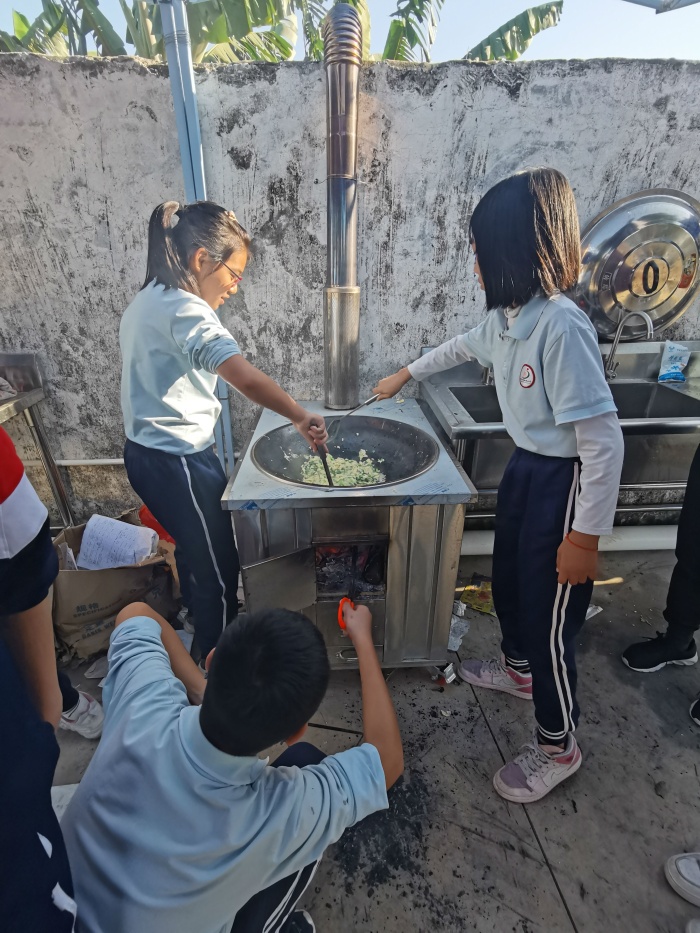 另一邊的同學正在用親手洗凈的蔬菜瓜果,為大家準備可口的晚餐。備柴生火、煮飯、切菜、炒菜,同學們輪流上崗,井然有序。經歷煙熏刺眼,爐火熄滅再燃等種種困難,同學們親手制作的飯菜,仿佛就是美味佳肴。