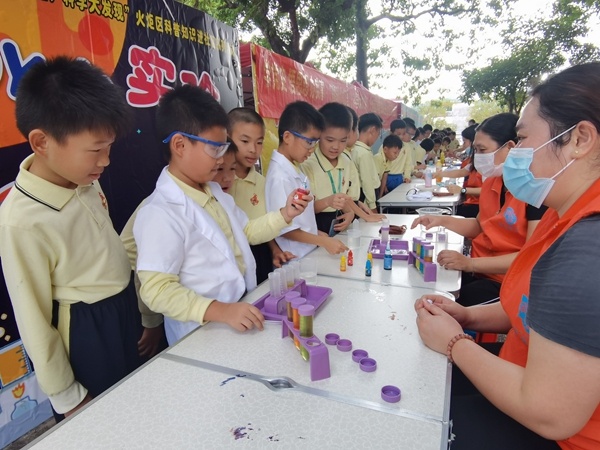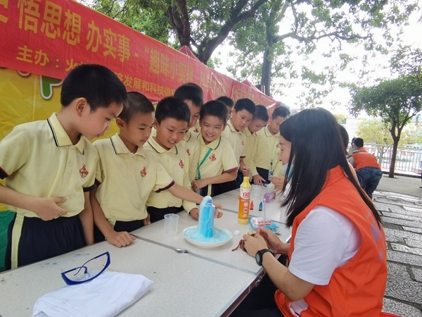 當日下午,開發區第三小學的“鳳凰臺”熱鬧非凡,工作人員為學生設置了6個不同的小實驗體驗區讓學生通過實踐更清晰地了解實驗原理的同時了解科學的魅力。在工作人員的引導下,學生們樂于動手實驗,儼然是一個個小科學家,讓學生近距離地感受了科學的神奇魅力。