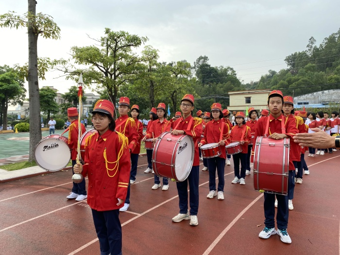 8點整,伴著鼓樂隊激昂的音樂,國旗隊、校旗隊踏著整齊有勁的步伐向我們走來。4名男生高擎國旗,邁著堅實有力的步伐,鮮艷的五星紅旗向全校師生傳達濃濃的愛國情懷。4名女生緊隨其后,步伐輕快,護著校旗,走向主席臺,校旗是坦洲三中大象征,更是“質樸、勤勉、敏行”校訓的體現,它將激發運動健兒的斗志,去創造本屆運動會的精彩。