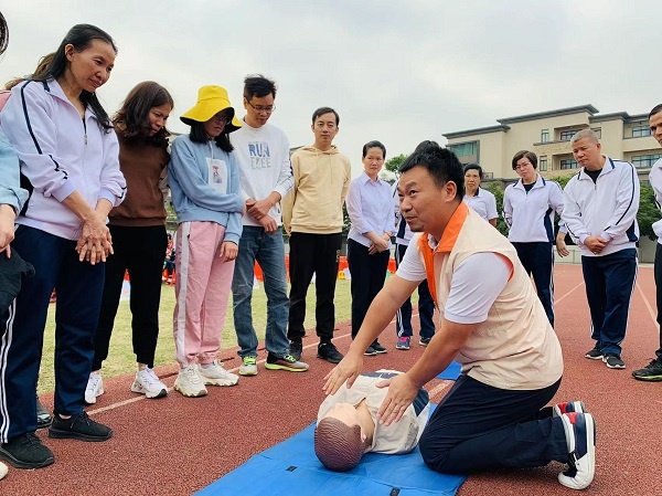 接下來(lái),學(xué)校邀請(qǐng)廣東伍玖伍安全文化科技有限公司培訓(xùn)人員進(jìn)行應(yīng)急救護(hù)培訓(xùn)活動(dòng),培訓(xùn)志愿者們邊講解邊指導(dǎo)學(xué)生體驗(yàn)了消防帳篷、逃生防毒面具試戴、模擬觸電、滅火器使用等場(chǎng)景。在這種互動(dòng)式體驗(yàn)活動(dòng)中,學(xué)生們興致盎然,參與度高。學(xué)生們既獲得了安全知識(shí)教育,又獲得了應(yīng)急操作經(jīng)驗(yàn)。培訓(xùn)志愿者對(duì)老師們進(jìn)行了心肺復(fù)蘇、人工呼吸、海姆立克法的培訓(xùn),通俗易懂的講解,很快教會(huì)了老師們掌握不少急救的技巧和規(guī)范性的操作。