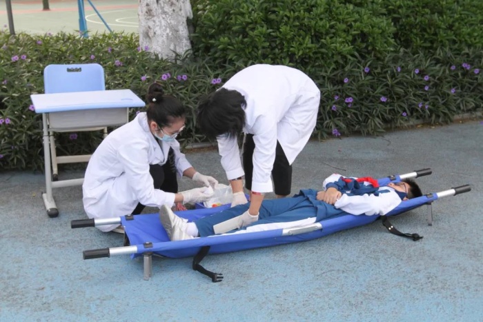 到達安全區域后,由各班班主任立刻清點人數層層上報。按照演練方案,行動組發現一名學生“被困” 教室,指揮組組長孫慧濤副校長發出“請立即組織搜救”的指示,自救隊立即對“受傷被困”學生進行救助。宿舍樓陽臺“冒煙著火”(煙霧彈模擬), 1 名生活老師晃動毛巾“呼救”,行動組組長孫慧濤副校長立即做出行動指示,指定保安人員打開消防栓進行滅火、拉好警戒線。同時,報 119 請求支援。消防隊員迅速響應,駕駛消防車進入校園開展救援。同時,“受傷被困”學生也被成功搜救出來,到醫療救助點進行包扎、檢查。