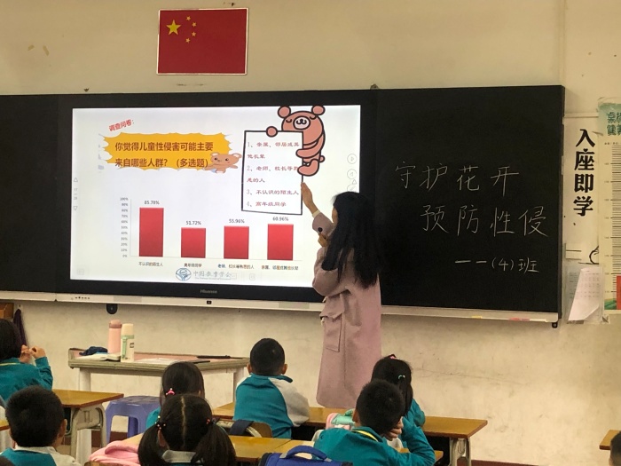 班會課上,老師借助多媒體輔助解說,與學(xué)生充分互動交流,從“教孩子們認(rèn)識隱私部位”“教孩子們識別實施性侵害的伎倆”等,給學(xué)生上了一堂保護未成年人的性教育課程,讓學(xué)生建立了“隱私”的概念,學(xué)會如何保護自己和尊重別人的隱私部位等知識。接著,課堂引入小游戲“身體紅綠燈”教孩子們?nèi)绾伪鎰e壞人、保護自己,當(dāng)面臨正在實施的性侵害如何處理、遭遇性侵害后如何尋求幫助等問題展開學(xué)習(xí),讓孩子們提高警惕,增強防范意識。