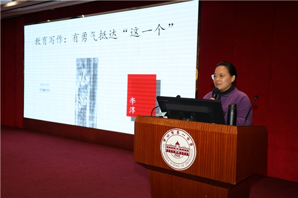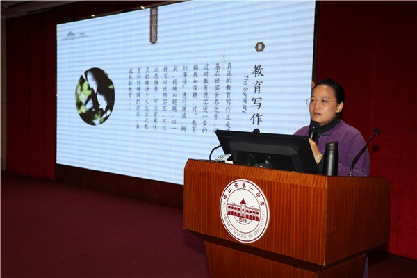 講座中,李淳女士從“積蘊人文的精神、開啟自我的教育、保留思考的過程、突破無形的框限、接壤生活的世界、提出切己的問題、朝向未來的自由”等七個方面為在場老師們介紹了自己對于教育寫作的認識和看法。她指出教育寫作是對教育現實的進一步拓展,廣大教師要自覺進行自我教育,在教育寫作的過程中要將教學現場具化。教育寫作沒有固定的模式,要接近現實,貼近人性。講座過程中,李淳女士還精心選擇了一些優秀的教育文章進行現場分享,讓教師們更直觀地感受優秀教育寫作的特點,更進一步體會到教育寫作應該具有的場景性、真實性、人文性。李淳女士還結合實際,指出老師在教育寫作的過程中往往會面臨功利排斥、定位過高、理性壓迫等教育寫作困境,她針對這些困境提出了相應的應對策略,鼓勵老師們多多進行有質量、有情懷的教育寫作。李淳女士還向老師們介紹了《師道》雜志師者情懷、書生氣象、草根力量的辦刊風格,指出《師道》雜志注重老師的人文情懷,注重對一線老師的鼓勵,希望老師們能多投稿,在《師道》中架起一座用學術、用人文教育寫作架起的教育工作者之間溝通的橋梁。
