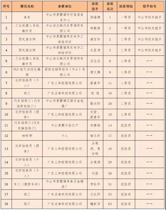 中山市第一屆職業(yè)技能大賽獲獎名單(黃圃鎮(zhèn))