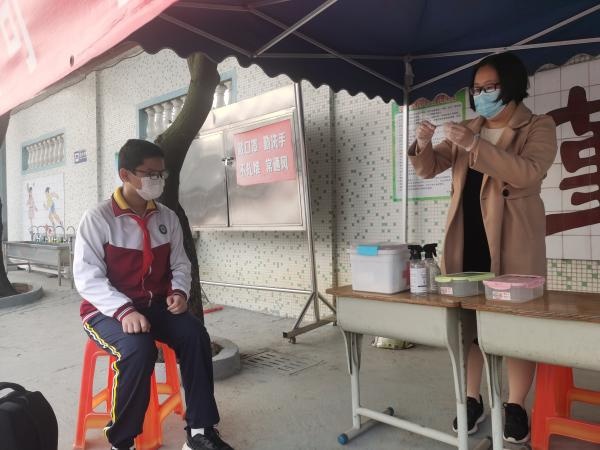 學校大門是校園疫情防控的第一道防線,把好校園第一道關卡至關重要。演練從模擬學生排隊等候進入校園開始,學生分兩個通道進入校門,經用體溫測量儀檢測學生體溫后,體溫正常者有序進入校園。當發現學生體溫異常時,迅速用水銀溫度計進行復測,如果體溫依舊異常,送至隔離室,上報行政并進行信息登記并聯系衛生部門作進一步處理。