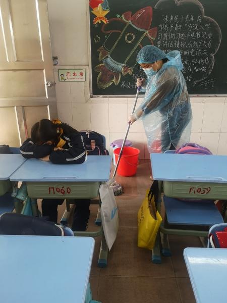 課室是學生主要的活動場所,演練第二階段,模擬任課教師上課期間,在教室里發現一學生萎靡不振,咳嗽,渾身發冷并伴有流感樣癥狀,馬上安排孩子與其他學生保持安全距離。將學生帶到校內隔離點,并通知相關負責領導。同時,班主任重點對教室進行消殺。