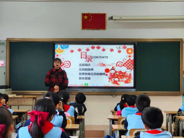本次活動在各班班主任對學(xué)生衷心的新年祝福中開始,班主任寄語學(xué)生們在新的一年里身體健康,學(xué)習(xí)進(jìn)步。簡單的語言,卻承載著老師最真心的祝福,同學(xué)們也紛紛用熱烈的掌聲表達(dá)對老師的感謝。緊接著,老師給學(xué)生講解了元旦相關(guān)的知識,如元旦的由來、世界各地的元旦習(xí)俗等等。