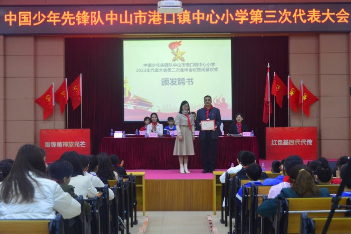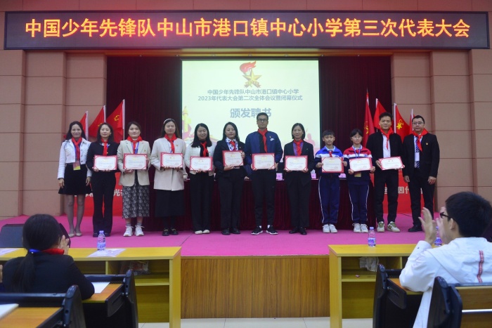 大隊委梁泉作港口鎮中心小學第三次代表大會籌備工作報告。少先隊大隊長五(1)中隊林浩燁向大會作少先隊工作報告。黃珈翎隊員宣讀《中國少年先鋒隊港口鎮中心小學第六屆大隊委候選人名單》和宣讀《中國少年先鋒隊港口鎮中心小學第三屆少工委委員候選人名單》并宣布港口鎮中心小學第六屆大隊委結果和宣布少工委三屆全委會選舉結果。隨后,大會頒發中心小學少工委正主任聘書、中心小學正、副總輔導員聘書、頒發中心小學少工委委員聘書。