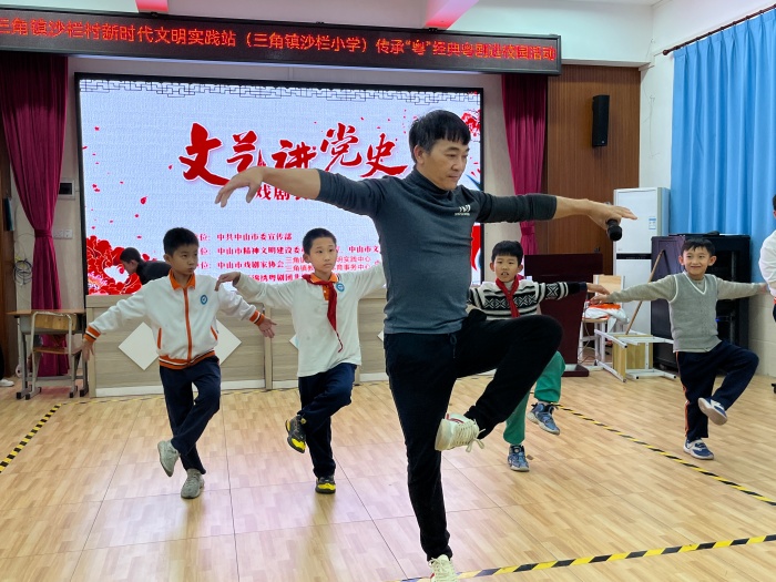 現場除了有精彩的講解和演繹,還有激動人心的互動環節。為了讓同學們更好地了解“四功五法”,在中山市花錦繡粵劇團老師的指導下,孩子們學習戲中人物身姿步法、眉眼神態,一招一式間,感受著戲曲獨特魅力。同學們親身體驗了一把粵劇的魅力,也展現出沙小人的粵韻風華。