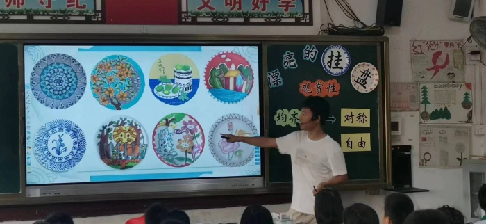 首先是李孟陽老師的美術課《漂亮的掛盤》。盤子是學生們常用的盛菜工具,而藝術掛盤卻是農村孩子不常見的工藝品,為了讓學生感受美術與生活的關系,李老師精心設計了本節課,通過視頻和圖片讓學生了解掛盤,感受其均齊式的韻律之美與平衡式的輕松自由之美,經過李老師細致地講解和投影畫畫示范,同學們開始創作。二十分鐘后,一幅幅精美而不重樣的掛盤作品浮現在眼前,李老師給予學生極大的肯定。一節課下來,學生學會了運用適合裝飾紋樣裝飾掛盤,也提高了欣賞美與創造美的能力。