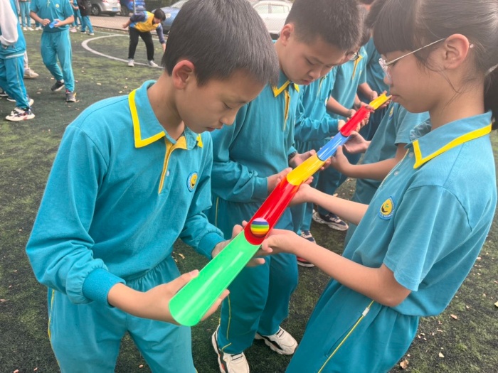 活動中,通過抽簽的形式把同學們分成4個小組,每組自行選出隊長、確定隊名和口號,隨后的“珠行萬里”環節,要求同學們分組站成一排,通過共同傳遞一個圓球,讓學員感受團隊間的配合、銜接以及自我控制能力,是培養團隊協作能力的游戲,這項游戲考驗的是孩子們彼此接納、協同合作的能力,在愉悅的氛圍中孩子們悄悄感受溝通的重要性。