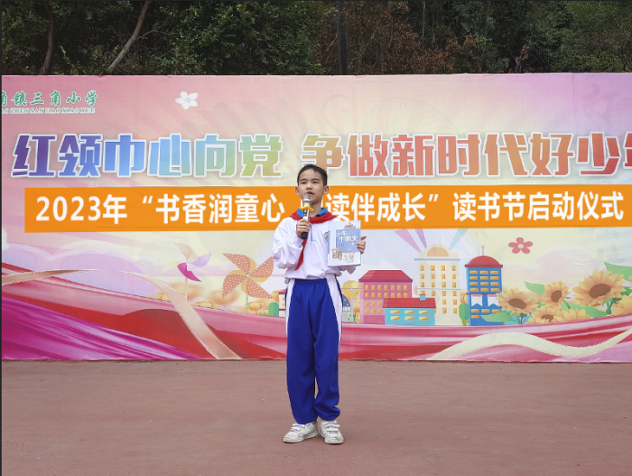 啟動儀式第二項,由三角小學副校長黃麗娟宣讀《三角鎮三角小學2023年“書香潤童心,閱讀伴成長”讀書節活動方案》。黃副校長向全體同學發出倡議,號召同學們積極參加讀書節的各項活動,將知識運用到學習及生活當中,努力做到知行合一。