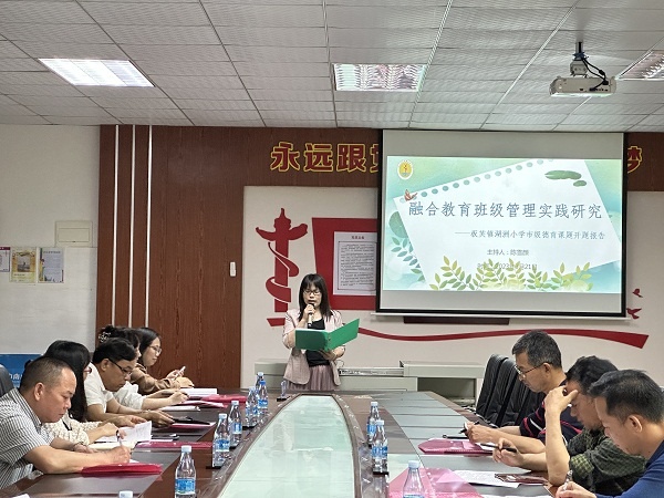 本次活動由湖洲小學德育副主任范丹丹老師主持?;顒邮紫扔烧n題主持人陳雪顏主任作開題報告。陳主任從課題的研究背景和理論依據、研究框架、研究思路、創新之處以及預計成果五個方面展開匯報,擬探討出小學融合教育的一些新思路、新方法,形成一套行之有效、具有普遍性意義的能力提升模式,以此推動融合教育更好地發展。