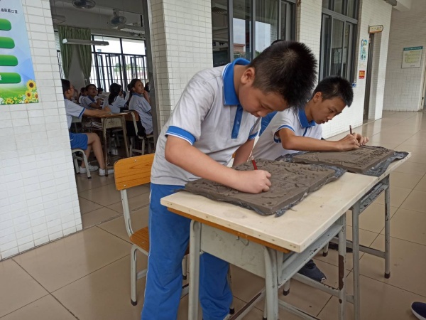 在開展陶板簽名儀式前,每個班級已根據自己的班級特色和理念設計了一塊感恩主題的陶板。有的班級以學校的美麗景色或花草樹木為版面來歌頌和感恩學校;有的以老師輔導學生、幫助學生等元素歌頌師生情,感恩師長;有的以帆船遨游大海設計元素來表達對未來的憧憬;也有以人物的元素裝飾板面表現(xiàn)七彩童年……每一塊主題鮮明,裝飾豐富,各有特色。簽名活動中,孩子們在美術科組全體老師的指引下有秩序地排隊,小心翼翼地在陶板上刻上自己的名字,為母校留下永恒的印跡,這對于師生來說是一次非常有意義的活動,讓畢業(yè)充滿了儀式感。