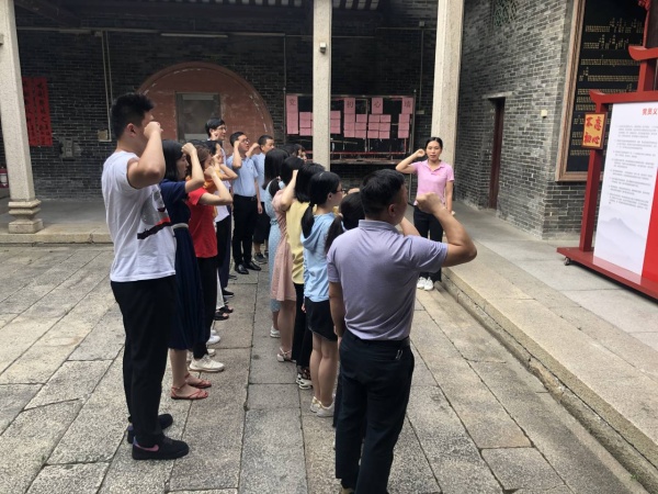 參觀完展板后,全體黨員在宗祠大廳門口集合,驕傲地挺起胸、握緊拳,莊嚴(yán)宣誓。“時(shí)刻準(zhǔn)備著!”鏗鏘恢弘的誓詞,強(qiáng)烈震撼著每一位黨員,指引黨員時(shí)刻遵守黨的章程,踐行黨的宗旨,做一名合格的共產(chǎn)黨員。