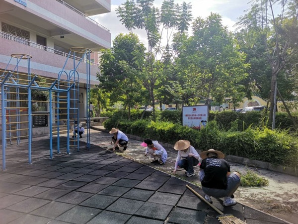 烈日炎炎下,潘校長身先士卒,蹲身彎腰,手持鐮刀清除了校園內外的長勢茂盛的雜草。在潘校長陽光積極的精神風貌的感染下,大家也充分發揚不怕臟、不怕苦、不怕累的精神,分工合作。有的手持鐵鉗,清理車棚陰暗犄角旮旯處的陳年垃圾;有的手持掃帚,清掃校園各條道路的垃圾、塵土;有的帶上手套,在綠化帶里拔去雜草、撿起垃圾;有的把各處集中的垃圾、廢紙、塑料袋等掃進垃圾簍,進行分類后再投放到對應的垃圾桶中。
